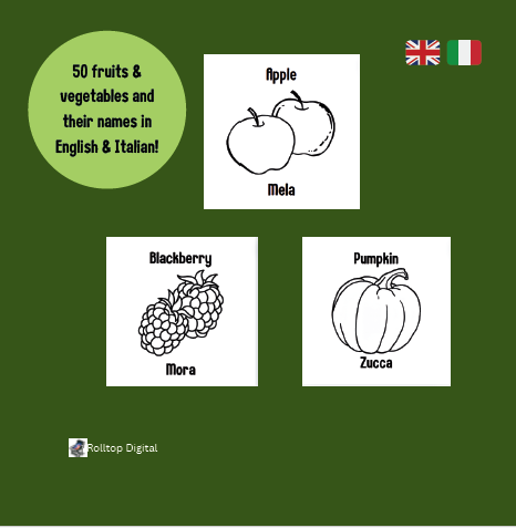 50 coloring pages of fruit and vegetables, along with their names in English and Italian!